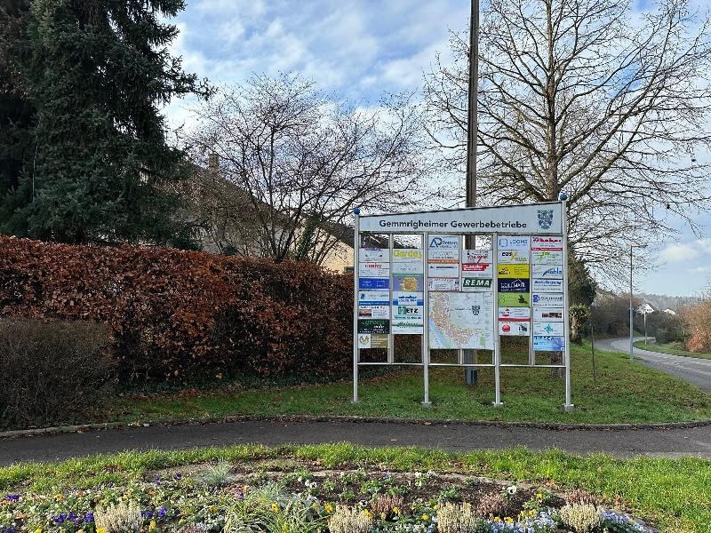 An der Einfahrt zum Industriegebiet „Niedere Klinge“ befindet sich die Hinweistafel der Gemmrigheimer Gewerbebetriebe. Dort kann jeder Gemmrigheimer Gewerbetreibende bzw. jedes Unternehmen mit Sitz in Gemmrigheim eine Werbetafel anbringen