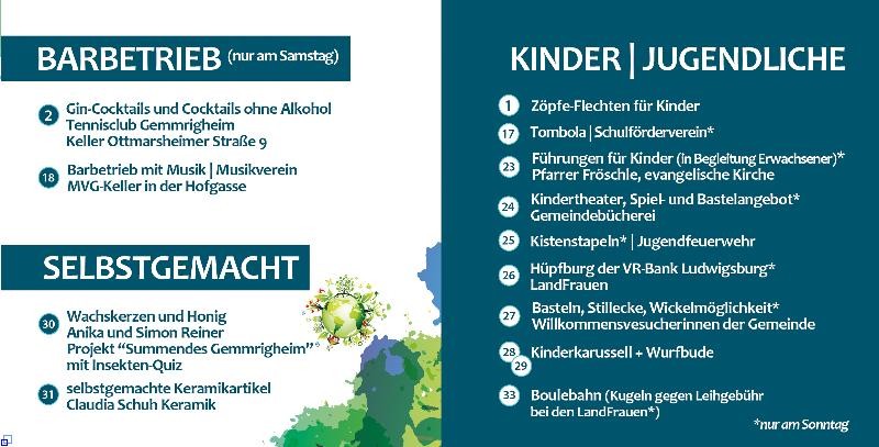 Die Standorte der einzelnen Teilnehmer, die beiden Bühnen sowie sämtliche Versorgungseinrichtungen haben wir in einem Flyer (PDF, 9,3 MB) zusammengefasst. Diesen erhalten Sie in Kürze im Bürgerbüro (Zimmer Z.02 im Erdgeschoß des Rathauses) und in der Gemeindebücherei. Er wird mit der Vollverteilung des Amtsblatts am 04.07.2025 in alle Gemmrigheimer Haushalte verteilt.